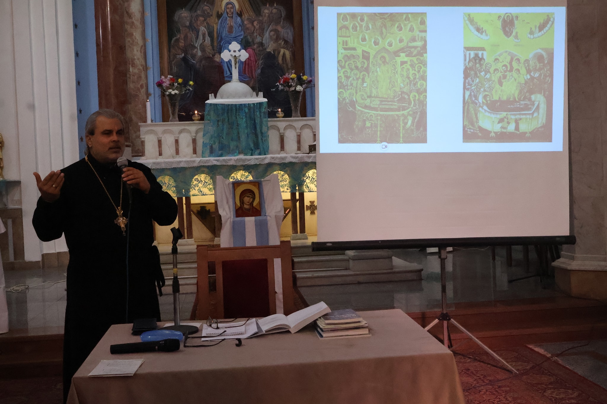 شارحاً عن فن الأيقونات , تاريخه, أصوله الروحية, التقنيات التي تعبر عن الإيمان من خلال الأبعاد والألوان ,داعماً أفكاره بعرض عدة أيقونات ورسومات توضيحية خلال اللقاء ..